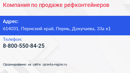 Компания по продаже рефконтейнеров по адресу 614031, Пермский край, Пермь, Докучаева, 33а к1 в дальнейшем Организация, размещена в следующих категориях: