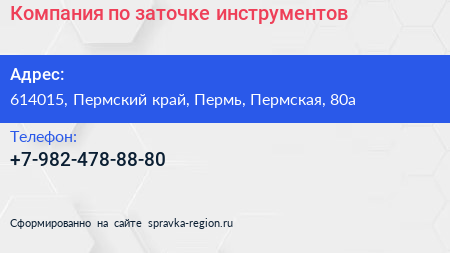 Компания по заточке инструментов по адресу 614015, Пермский край, Пермь, Пермская, 80а в дальнейшем Организация, размещена в следующих категориях: