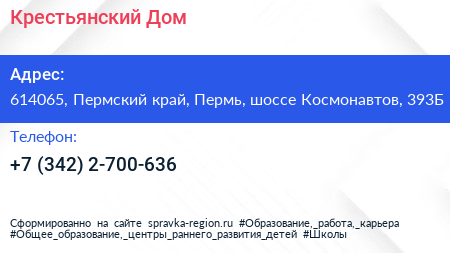 Крестьянский Дом по адресу 614065, Пермский край, Пермь, шоссе Космонавтов, 393Б в дальнейшем Организация, размещена в следующих категориях: