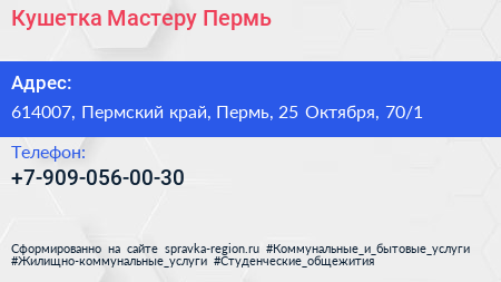Кушетка Мастеру Пермь по адресу 614007, Пермский край, Пермь, 25 Октября, 70/1 в дальнейшем Организация, размещена в следующих категориях:
