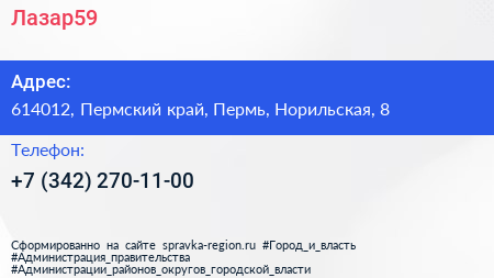 Лазар59 по адресу 614012, Пермский край, Пермь, Норильская, 8 в дальнейшем Организация, размещена в следующих категориях: