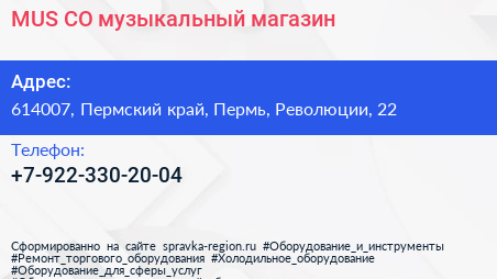 MUS & CO, музыкальный магазин по адресу 614007, Пермский край, Пермь, Революции, 22 в дальнейшем Организация, размещена в следующих категориях: