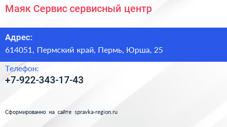 Маяк-Сервис, сервисный центр по адресу 614051, Пермский край, Пермь, Юрша, 25 в дальнейшем Организация, размещена в следующих категориях: