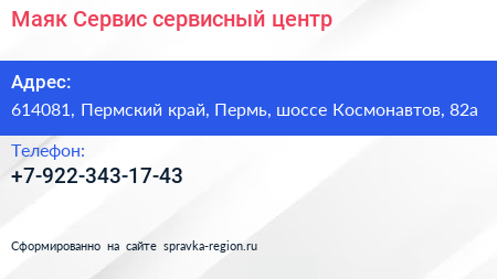 Маяк-Сервис, сервисный центр по адресу 614081, Пермский край, Пермь, шоссе Космонавтов, 82а в дальнейшем Организация, размещена в следующих категориях: