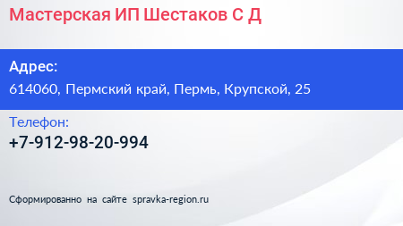 Мастерская, ИП Шестаков С.Д. по адресу 614060, Пермский край, Пермь, Крупской, 25 в дальнейшем Организация, размещена в следующих категориях: