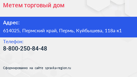 Метем, торговый дом по адресу 614025, Пермский край, Пермь, Куйбышева, 118а к1 в дальнейшем Организация, размещена в следующих категориях: