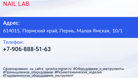 NAIL.LAB по адресу 614015, Пермский край, Пермь, Малая Ямская, 10/1 в дальнейшем Организация, размещена в следующих категориях: