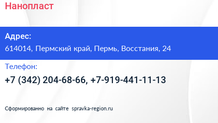 Нанопласт по адресу 614014, Пермский край, Пермь, Восстания, 24 в дальнейшем Организация, размещена в следующих категориях: