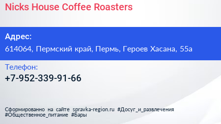 Nicks House Coffee Roasters по адресу 614064, Пермский край, Пермь, Героев Хасана, 55а в дальнейшем Организация, размещена в следующих категориях:
