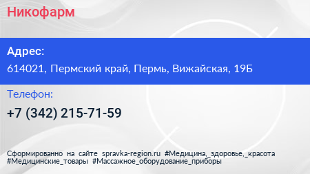 Никофарм по адресу 614021, Пермский край, Пермь, Вижайская, 19Б в дальнейшем Организация, размещена в следующих категориях: