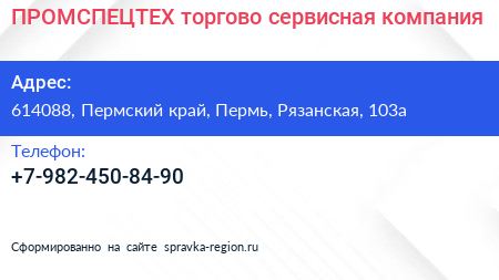 ПРОМСПЕЦТЕХ, торгово-сервисная компания по адресу 614088, Пермский край, Пермь, Рязанская, 103а в дальнейшем Организация, размещена в следующих категориях: