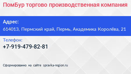 ПомБур, торгово-производственная компания по адресу 614013, Пермский край, Пермь, Академика Королёва, 21 в дальнейшем Организация, размещена в следующих категориях: