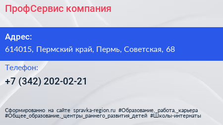 ПрофCервис, компания по адресу 614015, Пермский край, Пермь, Советская, 68 в дальнейшем Организация, размещена в следующих категориях: