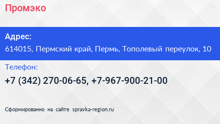 Промэко по адресу 614015, Пермский край, Пермь, Тополевый переулок, 10 в дальнейшем Организация, размещена в следующих категориях: