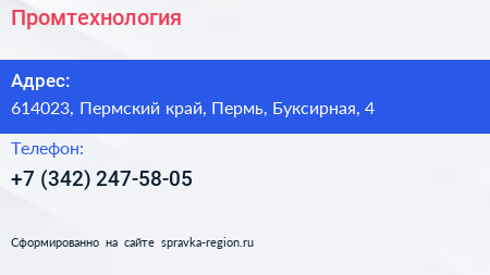 Промтехнология по адресу 614023, Пермский край, Пермь, Буксирная, 4 в дальнейшем Организация, размещена в следующих категориях: