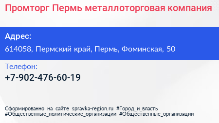 Промторг-Пермь, металлоторговая компания по адресу 614058, Пермский край, Пермь, Фоминская, 50 в дальнейшем Организация, размещена в следующих категориях: