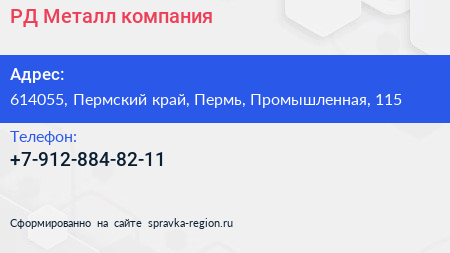 РД-Металл, компания по адресу 614055, Пермский край, Пермь, Промышленная, 115 в дальнейшем Организация, размещена в следующих категориях: