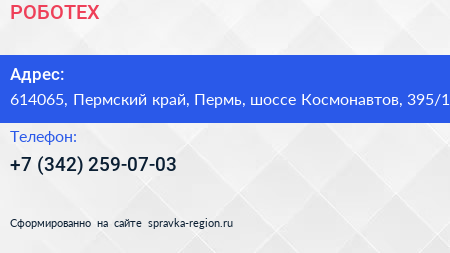 РОБОТЕХ по адресу 614065, Пермский край, Пермь, шоссе Космонавтов, 395/1 в дальнейшем Организация, размещена в следующих категориях: