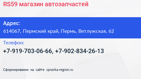 RS59, магазин автозапчастей по адресу 614067, Пермский край, Пермь, Ветлужская, 62 в дальнейшем Организация, размещена в следующих категориях: