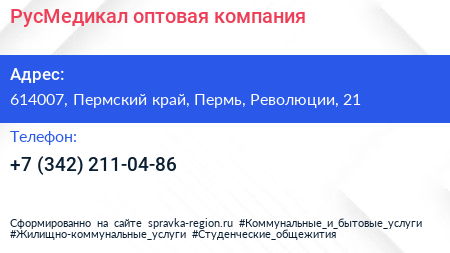 РусМедикал, оптовая компания по адресу 614007, Пермский край, Пермь, Революции, 21 в дальнейшем Организация, размещена в следующих категориях: