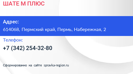ШАТЕ-М ПЛЮС по адресу 614068, Пермский край, Пермь, Набережная, 2 в дальнейшем Организация, размещена в следующих категориях: