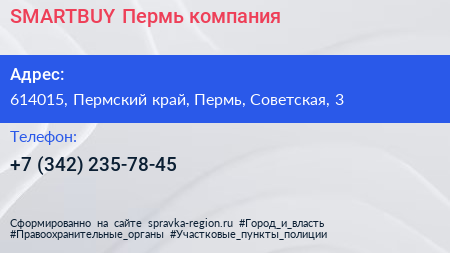 SMARTBUY Пермь, компания по адресу 614015, Пермский край, Пермь, Советская, 3 в дальнейшем Организация, размещена в следующих категориях:
