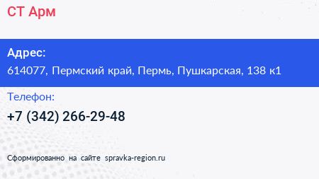 СТ-Арм по адресу 614077, Пермский край, Пермь, Пушкарская, 138 к1 в дальнейшем Организация, размещена в следующих категориях: