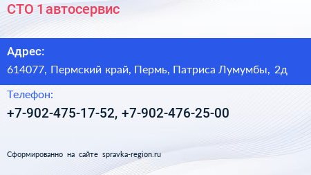 СТО №1, автосервис по адресу 614077, Пермский край, Пермь, Патриса Лумумбы, 2д в дальнейшем Организация, размещена в следующих категориях: