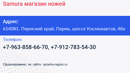 Samura, магазин ножей по адресу 614081, Пермский край, Пермь, шоссе Космонавтов, 48а в дальнейшем Организация, размещена в следующих категориях: