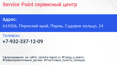 Service Point, сервисный центр по адресу 614506, Пермский край, Пермь, Садовое кольцо, 14 в дальнейшем Организация, размещена в следующих категориях: