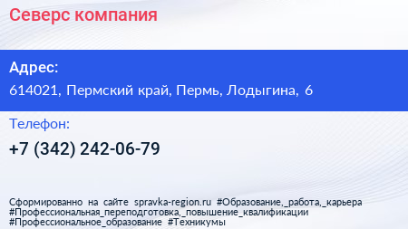 Северс, компания по адресу 614021, Пермский край, Пермь, Лодыгина, 6 в дальнейшем Организация, размещена в следующих категориях: