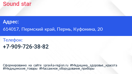 Sound star по адресу 614017, Пермский край, Пермь, Куфонина, 20 в дальнейшем Организация, размещена в следующих категориях:
