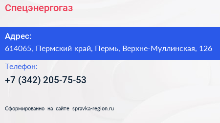 Спецэнергогаз по адресу 614065, Пермский край, Пермь, Верхне-Муллинская, 126 в дальнейшем Организация, размещена в следующих категориях: