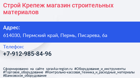 Строй Крепеж, магазин строительных материалов по адресу 614030, Пермский край, Пермь, Писарева, 6а в дальнейшем Организация, размещена в следующих категориях: