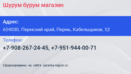 Шурум-бурум, магазин по адресу 614030, Пермский край, Пермь, Кабельщиков, 12 в дальнейшем Организация, размещена в следующих категориях: