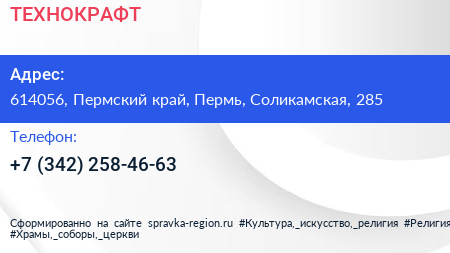 ТЕХНОКРАФТ по адресу 614056, Пермский край, Пермь, Соликамская, 285 в дальнейшем Организация, размещена в следующих категориях: