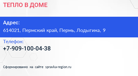 ТЕПЛО В ДОМЕ по адресу 614021, Пермский край, Пермь, Лодыгина, 9 в дальнейшем Организация, размещена в следующих категориях: