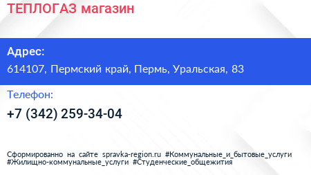 ТЕПЛОГАЗ, магазин по адресу 614107, Пермский край, Пермь, Уральская, 83 в дальнейшем Организация, размещена в следующих категориях: