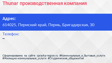 Thunar, производственная компания по адресу 614025, Пермский край, Пермь, Бригадирская, 30 в дальнейшем Организация, размещена в следующих категориях: