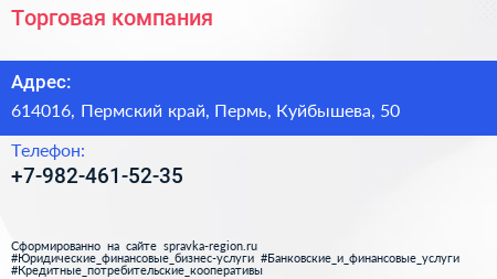 Торговая компания по адресу 614016, Пермский край, Пермь, Куйбышева, 50 в дальнейшем Организация, размещена в следующих категориях:
