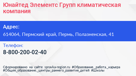 Юнайтед Элементс Групп, климатическая компания по адресу 614064, Пермский край, Пермь, Полазненская, 41 в дальнейшем Организация, размещена в следующих категориях: