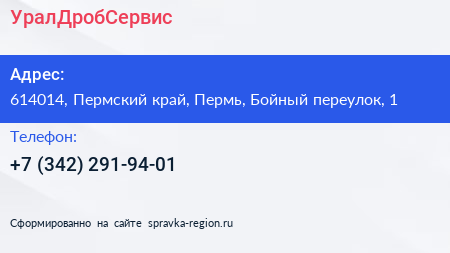 УралДробСервис по адресу 614014, Пермский край, Пермь, Бойный переулок, 1 в дальнейшем Организация, размещена в следующих категориях: