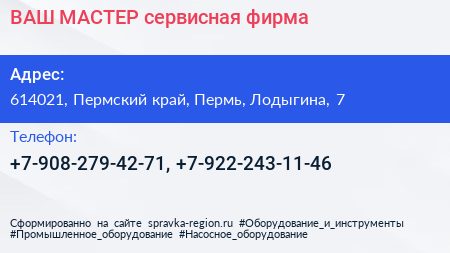 ВАШ МАСТЕР, сервисная фирма по адресу 614021, Пермский край, Пермь, Лодыгина, 7 в дальнейшем Организация, размещена в следующих категориях: