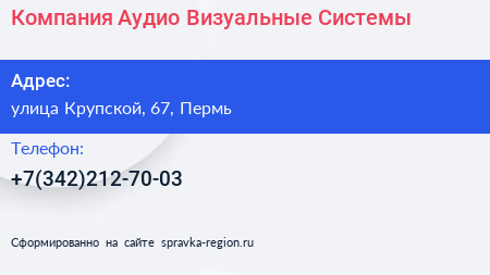 Компания Аудио Визуальные Системы по адресу улица Крупской, 67, Пермь в дальнейшем Организация, размещена в следующих категориях: