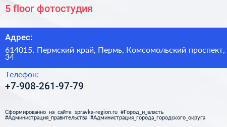 5 floor, фотостудия по адресу 614015, Пермский край, Пермь, Комсомольский проспект, 34 в дальнейшем Организация, размещена в следующих категориях: