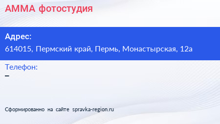 АММА, фотостудия по адресу 614015, Пермский край, Пермь, Монастырская, 12а в дальнейшем Организация, размещена в следующих категориях: