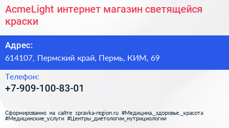 AcmeLight, интернет-магазин светящейся краски по адресу 614107, Пермский край, Пермь, КИМ, 69 в дальнейшем Организация, размещена в следующих категориях: