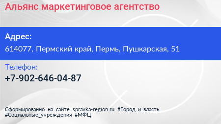 Альянс, маркетинговое агентство по адресу 614077, Пермский край, Пермь, Пушкарская, 51 в дальнейшем Организация, размещена в следующих категориях: