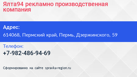 Ялта94, рекламно-производственная компания по адресу 614068, Пермский край, Пермь, Дзержинского, 59 в дальнейшем Организация, размещена в следующих категориях: