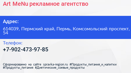 Art MeNu, рекламное агентство по адресу 614039, Пермский край, Пермь, Комсомольский проспект, 54 в дальнейшем Организация, размещена в следующих категориях: